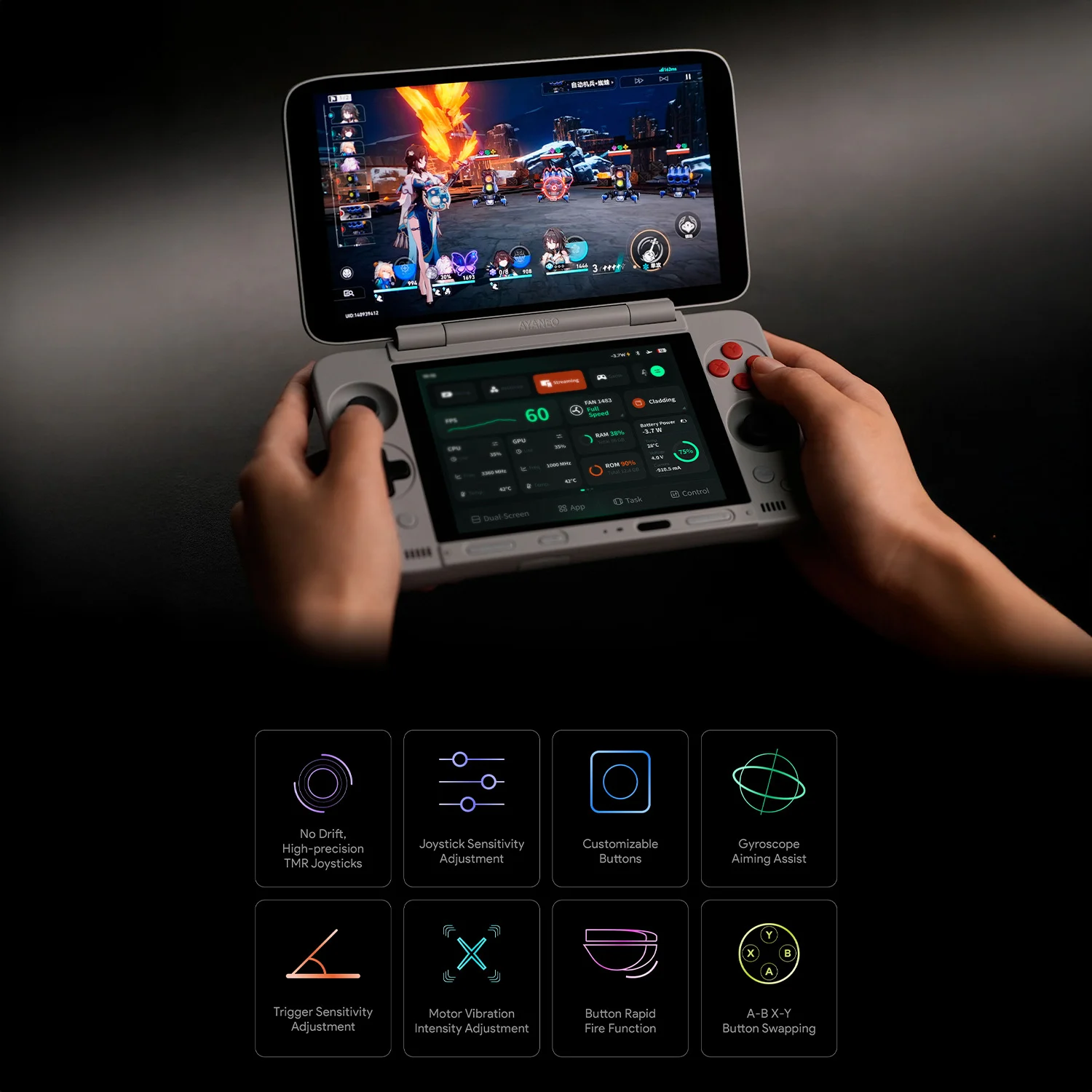Powering the revolutionary experience of the AYANEO Pocket DS is a highly optimized Android 13 operating system, engineered from the ground up to leverage its unique dual-screen capabilities. Dive into a massive universe of compatible games, from modern Android hits to nostalgic classics that feel right at home on two screens. Seamless connectivity is guaranteed with High-Speed WiFi and Bluetooth 5.3, perfect for online raids or pairing your favorite controller. At the heart of the user experience is the powerful AYASpace & AYAHome software, which not only organizes your library but also offers dedicated dual-screen management keys to instantly swap, manage, and customize your displays on the fly. For swift, secure access to your world of gaming, a fingerprint sensor is integrated directly into the power button.